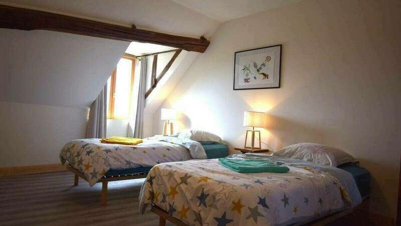 Chambre privée en duplex avec 4 lits simples et salle d'eau, spacieuse et lumineuse, situé au deuxième étage d'une maison à pans de bois du XVIe siècle, au cœur de Joigny. Charme de l'ancien subtilement rénové, alliant authenticité et confort moderne. Vous partagerez les espaces commun avec d'autres voyageurs dans une atmosphère conviviale.